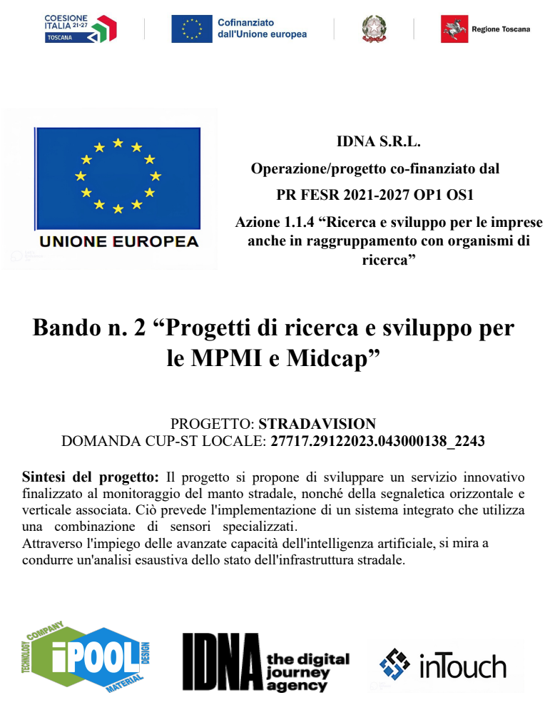 Il progetto parte da TRL 3 per la parte relativa alla segnaletica e TRL 5 per quella riguardante l’analisi del manto stradale, con l’obiettivo di raggiungere un TRL 7 complessivo. La realizzazione coinvolge iPOOL, responsabile di integrazione e IA, inTouch, incaricata del software di gestione, e iDNA, dedicata alla piattaforma web per la fruizione dei risultati.La proposta è in linea con le politiche europee di sicurezza stradale e si concentra anche su sostenibilità economica e ambientale, poiché un’adeguata manutenzione permette di ridurre i consumi di carburante e le emissioni, allungando la vita utile delle infrastrutture e garantendo prestazioni più elevate nel tempo.